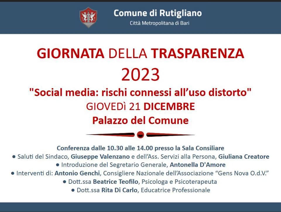Evento tenutosi presso la Sala Consiliare del Comune di Rutigliano, nell’ambito della giornata sulla trasparenza 2023 organizzata dall’Ente Pubblico, sul tema: “SOCIAL MEDIA: RISCHI CONNESSI ALL’USO DISTORTO”.