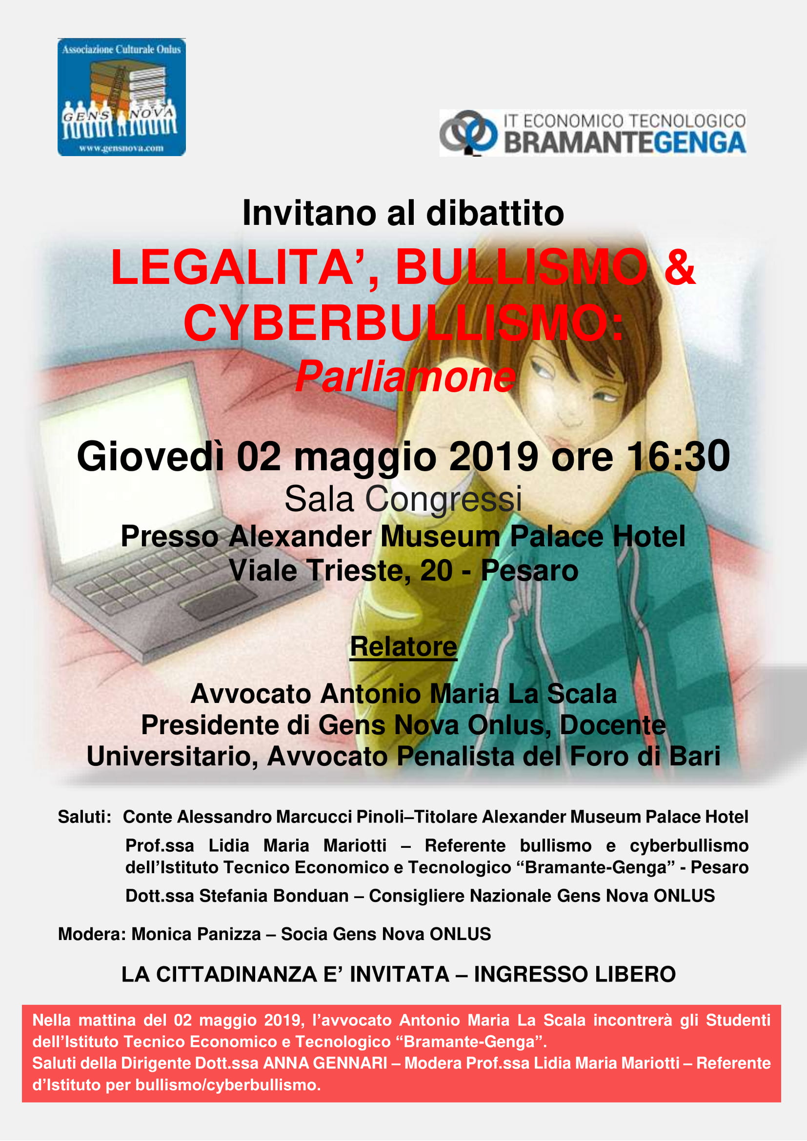 Obiettivi dell’evento: Gens Nova, incontrerà i genitori degli studenti dell’Istituto Tecnico Economico e Tecnologico “Bramante Genga” di Pesaro e la cittadinanza per approfondire il delicato tema connesso all’utilizzo improprio della tecnologia ed alle conseguenze, anche dal risvolto giuridico, legate a condotte inopportune e improprie verso i propri coetanei e/o pari.