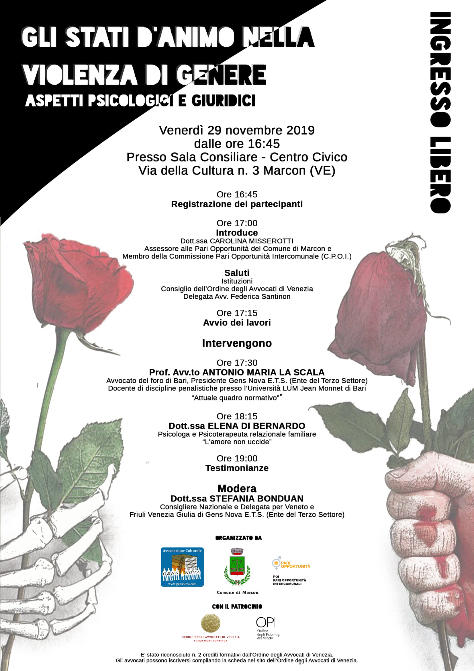 Evento organizzato e promosso da Gens Nova Od.V. nella persona della delegata e consigliere nazionale dott.ssa Stefania Bonduan, insieme al Comune di Marcon, nella persona dell’Assessore alle Pari Opportunità Carolina Misserotti e alla Commissione Pari Opportunità Intercomunale (che comprende i Comuni di Casale sul Sile, Casier, Preganziol, Mogliano Veneto, Zero Branco e Marcon) presieduta da Sonia Forestan, Consigliere con delega alle Pari Opportunità del Comune di Casale sul Sile.